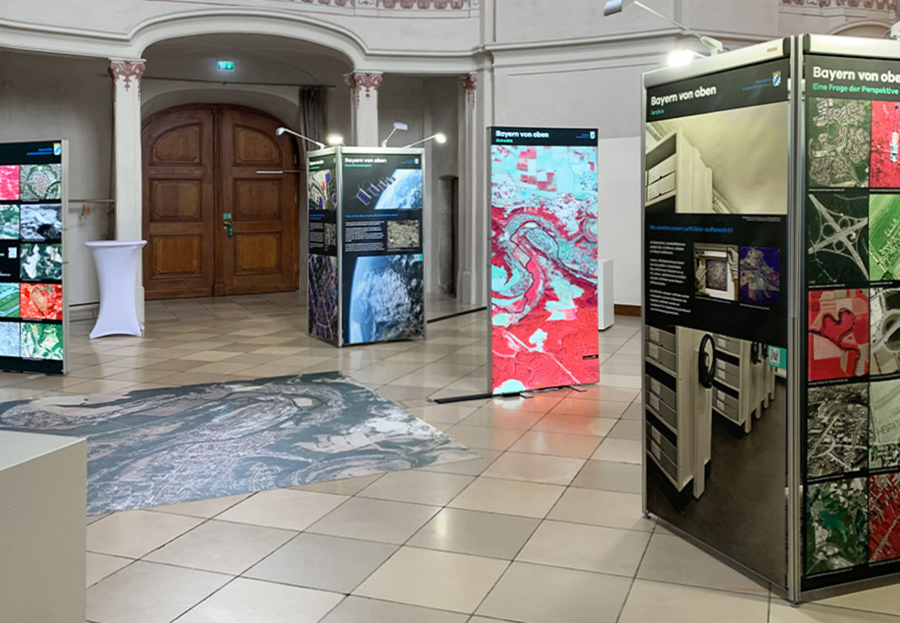 Anlässlich des fünfjährigen Bestehens des Bayerischen Landesluftbildzentrums stellte die Wanderausstellung dessen Angebote einem breiten Publikum vor. Die multimedial gestaltete und leicht verständlich aufbereitete Ausstellung vermittelt einen spannenden Einblick in die Geschichte und Technik der Luftbildfotografie. Auf 14 Ausstellungstafeln wurde den Besucherinnen und Besuchern gezeigt, wie Luftbilder gemacht werden, wie sie aufbereitet werden und wo sie eingesetzt werden.